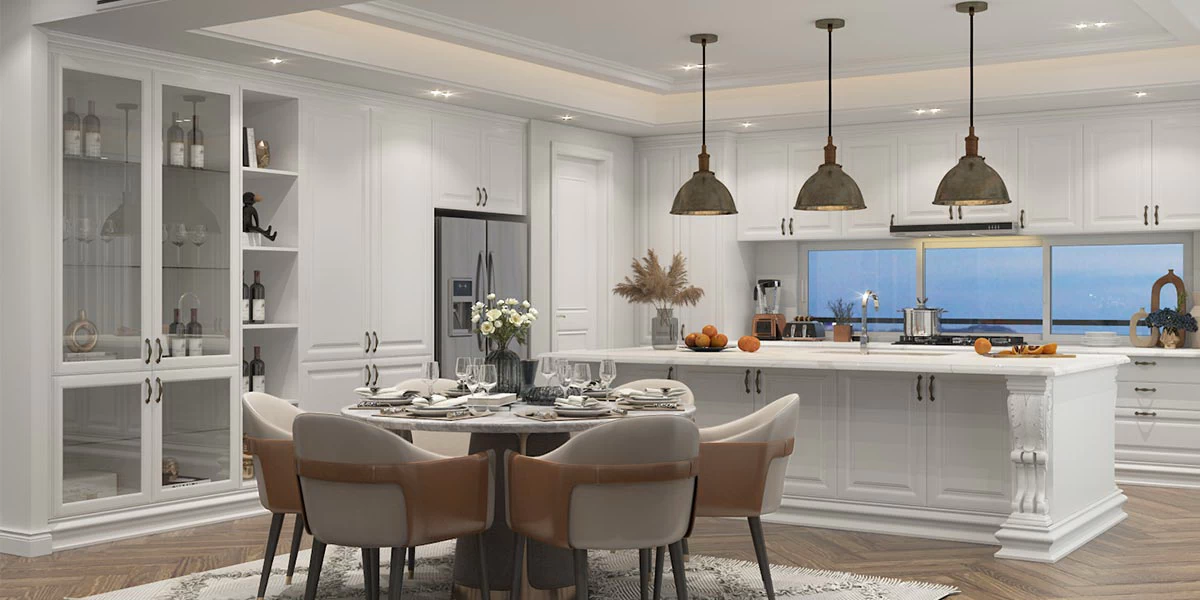 Traditional kitchens are charming, exquisite, and full of character. Shaker doors are a timeless option that will suit any house style, from modern to traditional. It can create a warm and welcoming atmosphere in your home. This all-white kitchen is simple, clean, and airy in an open-plan style. There are enough base, wall, and high cabinets for a large family’s food, condiment, and kitchenware storage. There are 4 rounded columns on the white kitchen island with beautiful millwork decorative shape, which makes the kitchen design more elegant and luxurious.
